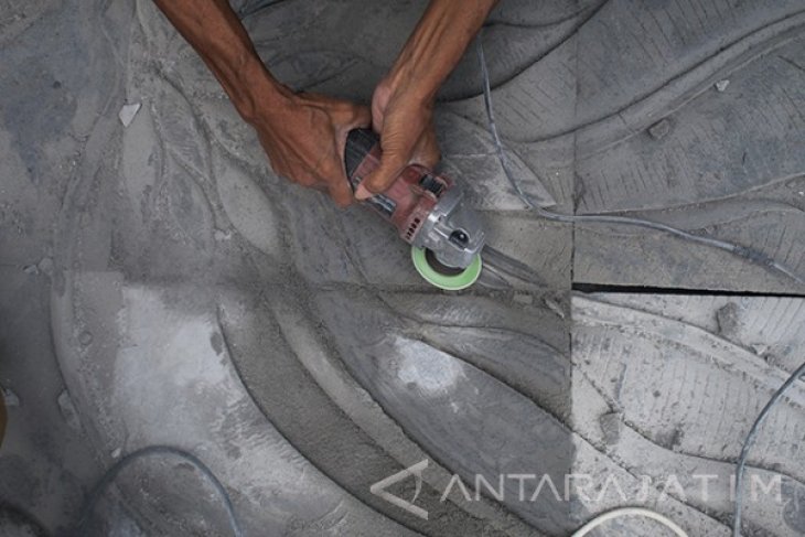 Perajin melakukan proses pembuatan relief di Trowulan, Mojokerto, Jawa Timur, Sabtu (8/4). Kerajinan patung dari batu kali yang diperoleh dari berbagai daerah di Jawa Timur tersebut dijual dengan harga Rp 600 ribu- Rp 180 juta tergantung ukuran dan tingkat kesulitan. Antara Jatim/Naufal Ammar/zk/17