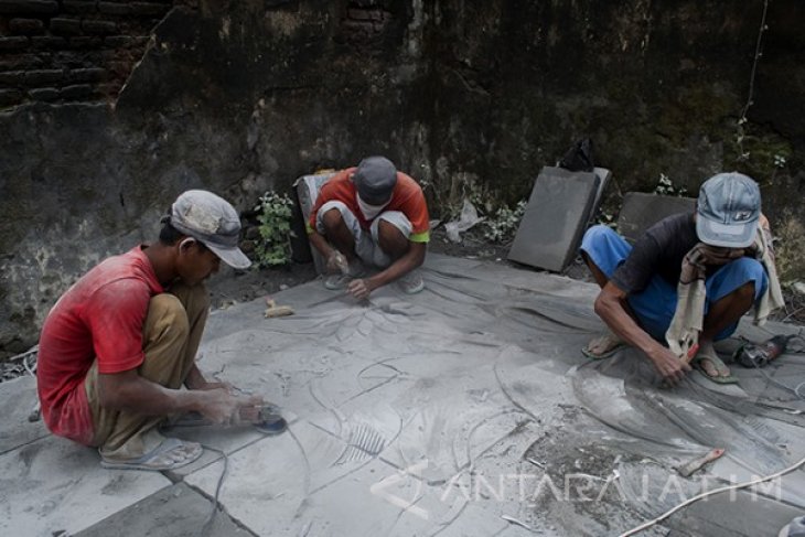 Sejumlah perajin melakukan proses pembuatan relief di Trowulan, Mojokerto, Jawa Timur, Sabtu (8/4). Kerajinan patung dari batu kali yang diperoleh dari berbagai daerah di Jawa Timur tersebut dijual dengan harga Rp 600 ribu- Rp 180 juta tergantung ukuran dan tingkat kesulitan. Antara Jatim/Naufal Ammar/zk/17