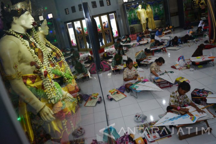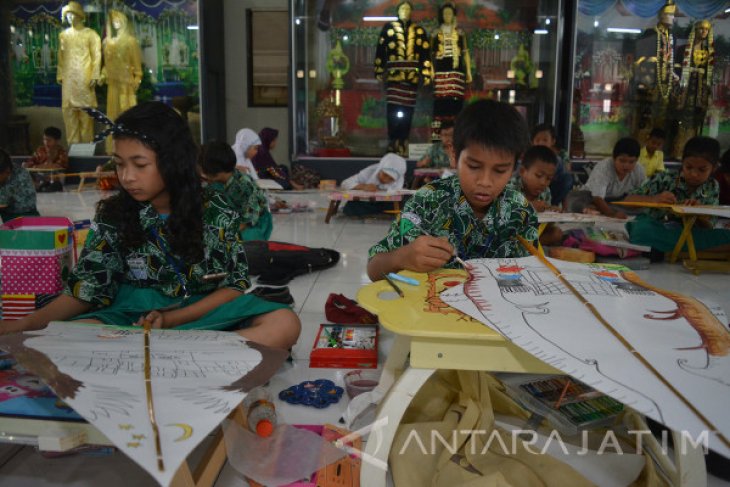 Sejumlah siswa melukis Gunungan Wayang di Museum Negeri Mpu Tantular, Buduran, Sidoarjo, Jawa Timur, Kamis (19/10). Festival Tantular yang diselenggarakan dengan tema 'Menelusuri Kebesaran Sejarah Jawa Timur Melalui Keanekaragaman Wayang' tersebut bertujuan untuk mengenalkan sejarah dan budaya. Antara Jatim/Umarul Faruq/uma/17