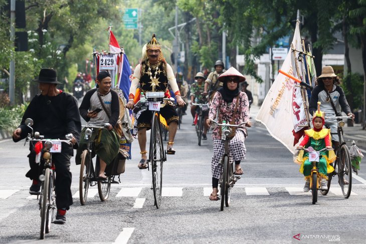 Peserta mengikuti kirab Sepeda Onthel di Surabaya, Jawa Timur, Minggu (22/12/2019). Kegiatan itu merupakan salah satu rangkaian acara untuk memeriahkan HUT ke-71 Kodam V/Brawijaya. Antara Jatim/Didik/ZK