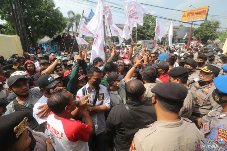 Warga yang tergabung dalam Ikatan Pemuda Kediri melakukan unjuk rasa di depan kantor ACC Finance, Kota Kediri, Jawa Timur, Selasa (8/6/2022). Aksi yang diikuti puluhan orang tersebut menolak praktik oknum debt collector yang menarik secara paksa kendaraan bermotor penunggak cicilan di jalan karena dinilai sebagai bentuk aksi premanisme dan merugikan masyarakat. ANTARA Jatim/Prasetia Fauzani/zk