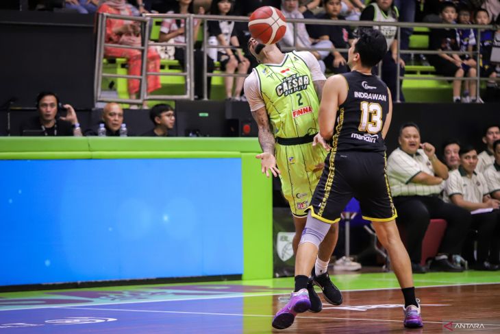 Pebasket Pacific Caesar Surabaya Adonnecy Joshua Bramah (kiri) berusaha melewati adangan pebasket Kesatria Bengawan Solo Ponsianus Nyoman Indrawan (kanan) pada pertandingan Indonesian Baskeball League (IBL) 2025 di GOR Pacific Caesar Surabaya, Jawa Timur, Kamis (14/6/2025). Pacific Caesar Surabaya menang atas Kesatria Bengawan Solo dengan skor 110-104. Antara Jatim/Rizal Hanafi/um