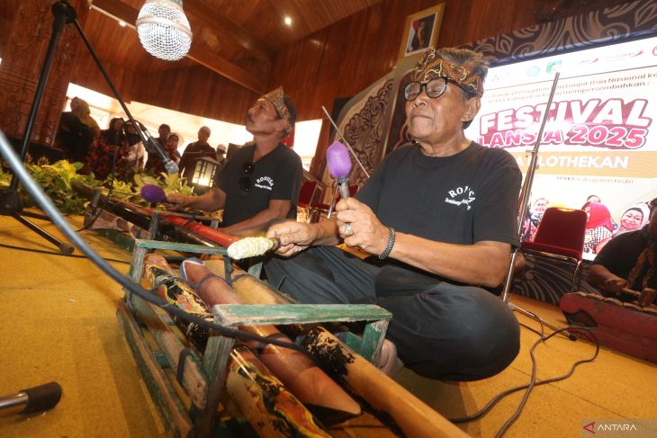 Warga lanjut usia (lansia) mengikuti lomba kluthekan (musik kontemporer menggunakan berbagai macam bunyi-bunyian) pada Festival Lansia 2025 di Kabupaten Kediri, Jawa Timur, Selasa (24/6/2025). Festival Lansia 2025 yang diselenggaraan pemerintah daerah setempat tersebut diisi dengan kegiatan lomba merias wajah, peragaan busana, dan lomba kluthekan sebagai upaya sosialisasi hidup sehat sekaligus mendongkrak kepesertaan posyandu lansia. ANTARA Jatim/Prasetia Fauzani/mas.