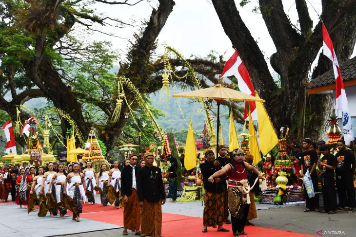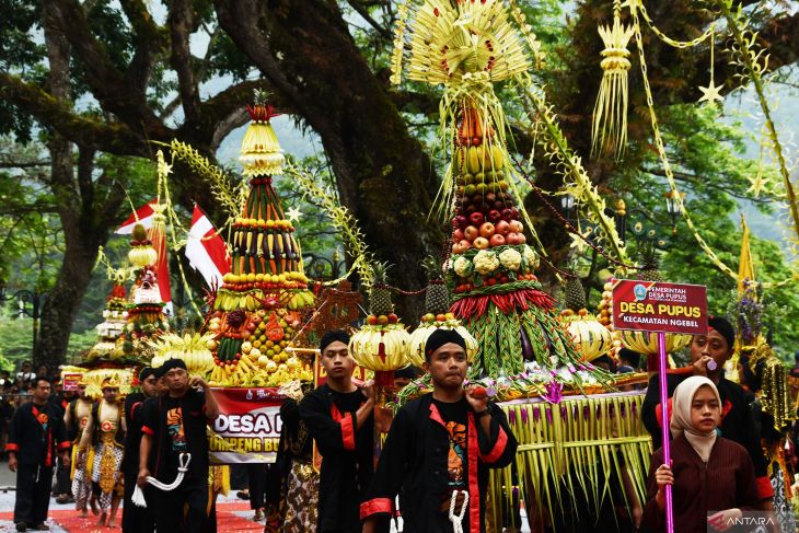 Sejumlah orang mengusung gunungan dari hasil bumi sebelum dibagikan kepada warga pada acara tradisi Larungan Telaga Ngebel di Ponorogo, Jawa Timur, Jumat (27/6/2025). Kegiatan budaya tersebut untuk menyambut awal tahun baru dalam penanggalan Jawa 1 Suro bersamaan tahun baru Hijriyah 1 Muharam. Antara Jatim/Siswowidodo/um