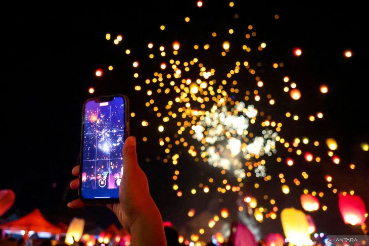 Pengunjung mengabadikan momen penerbangan lampion saat Dworowati Lantern Festival di Pujon, Malang, Jawa Timur, Sabtu (28/6/2025). Agenda tahunan yang diselenggarakan Pemerintah Desa setempat dengan tujuan sebagai ungkapan rasa syukur atas hasil bumi yang melimpah sekaligus ajang promosi wisata dan produk umkm lokal itu mampu menarik ribuan pengunjung dari berbagai daerah. ANTARA Jatim/Muhammad Mada/mas.