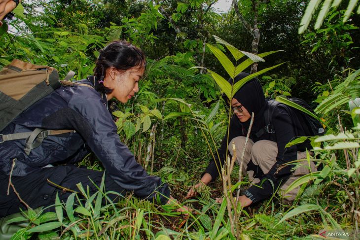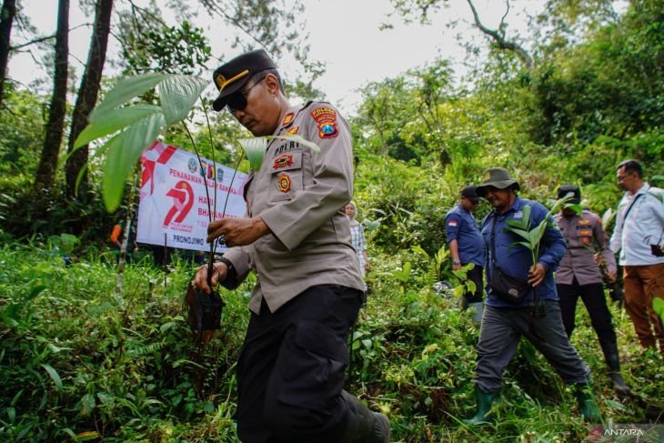 Relawan menanam bibit pohon Pinang Jawa di kawasan hutan Taman Nasional Bromo Tengger Semeru (TNBTS), Pronojiwo, Lumajang, Jawa Timur, Selasa (8/7/2025). Polsek Pronojiwo bersama TNBTS menggelar penanaman 79 bibit pohon Pinang Jawa di kawasan hutan Ranu Darungan dalam rangka melestarikan sumber mata air sekaligus memperingati hari Bhayangkara ke 79. ANTARA Jatim/Irfan Sumanjaya/mas.