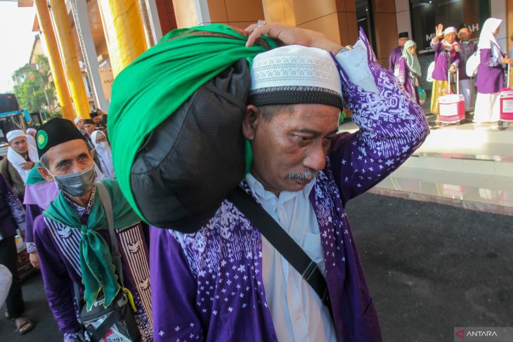 Jamaah haji dari kelompok terbang (kloter) 97 berjalan menuju gedung Muzdalifah setibanya di Asrama Haji Sukolilo Surabaya, Surabaya, Jawa Timur, Jumat (11/7/2025). Pihak Panitia Penyelenggara Ibadah Haji (PPIH) Debarkasi Surabaya menerima kedatangan 322 haji yang merupakan kloter terakhir yang tiba di Surabaya usai menunaikan ibadah haji di Tanah Suci. Antara Jatim/Didik Suhartono/um