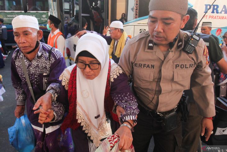 Polisi menggandeng jamaah haji dari kelompok terbang (kloter) 97 berjalan menuju gedung Muzdalifah setibanya di Asrama Haji Sukolilo Surabaya, Surabaya, Jawa Timur, Jumat (11/7/2025). Pihak Panitia Penyelenggara Ibadah Haji (PPIH) Debarkasi Surabaya menerima kedatangan 322 haji yang merupakan kloter terakhir yang tiba di Surabaya usai menunaikan ibadah haji di Tanah Suci. Antara Jatim/Didik Suhartono/um