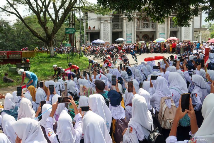 Ratusan pelajar menyaksikan pembalap yang beradu cepat pada kompetisi Balap sepeda interntional Tour de Banyuwangi Ijen (TdBI) 2025 di Banyuwangi, Jawa Timur, Senin (28/7/2025). Etape pertama yang menempuh jarak 125,5 kilometer dari Pasar Pesanggaran dan finis di Kantor Bupati Banyuwangi yang didominasi lintasan datar itu di menangkan pembalap Belanda Jeroen Meijers dari Tim Victoria Sports Pro Cycling. Antara Jatim /Budi Candra Setya/um