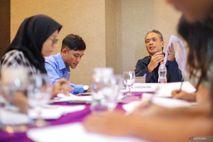 Penguji dari Perum LKBN ANTARA M. Zarqoni Maksum (kanan) memberikan pengarahan kepada peserta saat pelaksanaan Uji Kompetensi Wartawan (UKW) di Surabaya, Jawa Timur, Rabu (30/7/2025). Perum LKBN ANTARA melalui Lembaga Pendidikan Antara (LPA) menggelar UKW yang diikuti 30 wartawan dengan mengusung tema Tantangan dan Peluang Jurnalisme di Era Digital. ANTARA Jatim/Rizal Hanafi/mas.